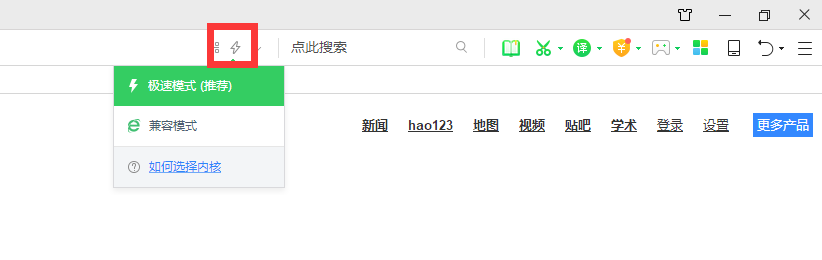 点击地址栏的内核切换按钮,可以手动切换浏览模式,点击极速模式(推荐)选择极速模式。