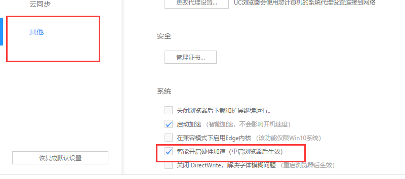 选择【其他】,点击【智能开启硬件加速(重启浏览器后生效)】