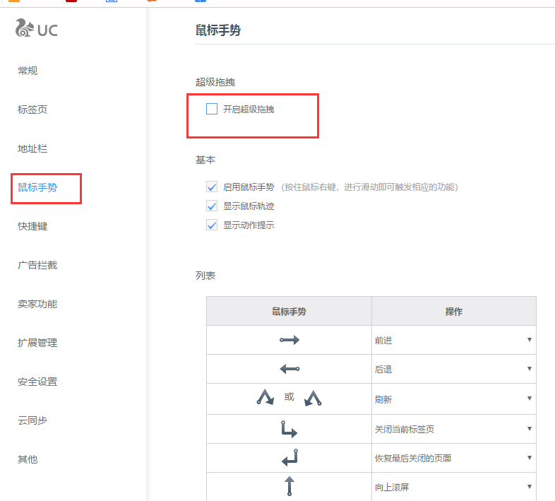 选择【鼠标手势】,把【开启鼠标手势】前面的对勾去掉,关闭鼠标手势。