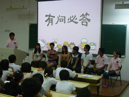 首先,主持人以一段视频揭开了交流会的序幕,向同学们展示了人文团学所开展的丰富多彩的活动。接下来,麻老师在讲话中对新生们提出了几点颇有教益的建议。而后,有趣的小游戏迅速调动起了现场的气氛。之后,几十张珍贵的照片以学习、工作、创业三个主题勾起了新生们对大学生活的无限憧憬。最后,进入"有问必答"环节。七位大三大四的学长学姐坐到台前,为新同学们一一解答对于大学生活的疑问。