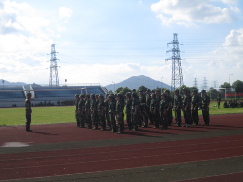 9月8日上午8点,温州大学全体09届学员在南校区和北校区的体育场继续进行为期六日的军事训练。来自温州武警支队的教官带领同学们进行操练。
