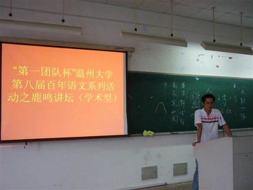 2010年6月3日下午,在人文楼201教室“第一团队杯”温州大学第八届百年语文系列活动之鹿鸣讲坛(学习型)坛主08中本三班张佳峰同学开设了一场题为“中国艺术生命精神和性灵寄托为题研究”的讲座。
