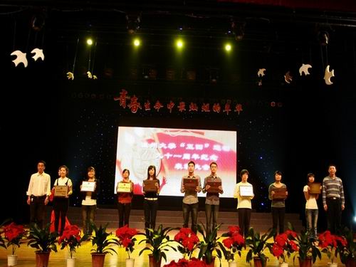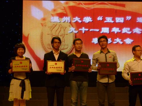 5月7日晚上,温州大学“五•四”运动九十一周年纪念表彰大会在大学生活动中心演艺厅隆重举行。校党委副书记牟德刚、校团委及各学院负责人、团委书记和来自各学院1200多名团员青年代表参加了这次纪念表彰大会。我院团委凭借优异的成绩荣获三项大奖。