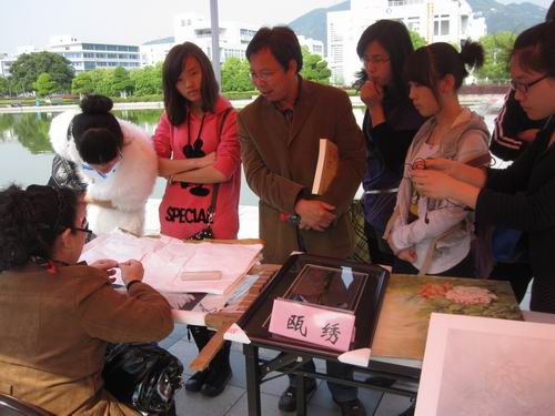 温州具有悠久的历史,从东晋明帝太宁元年建城开始至今已有1700多年的历史了。温州向来有“七山二水一分田”之说,这样的地理环境也为温州赢来了“百工之乡”的美称。近年来温州很多工艺都成了“全国非物质文化遗产”。本次活动由于很多美术家的参与,吸引了很多大学生的兴趣。本次活动在温州大学北校区人工湖畔展开,现场热烈非凡,同学积极参与。大家怀着极大地好奇心在各个展柜前参观、学习并亲自实践。现场有道情表演、提线木偶和舞龙表演等,引来大家阵阵掌声。活动现场还有现场教你学剪纸的活动项目,许多同学都跃跃欲试,两百份红宣纸在同学手中很快都成了艺术品。