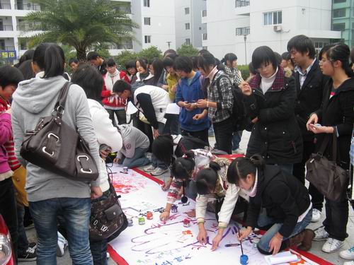 一块洁白的长画布在c区中心花园平铺,画布旁摆满了颜料和画笔等相关工具。活动如火如荼地进行着,越来越多的同学们前来涂鸦。有同学在精心绘画,有的同学在挥毫泼墨,还有的同学别具匠心,在画布上留下了一串串手印。一个个大大的签名,一条条激扬的寄语,,长长的画布,流淌着人文学子的创意,满载着深深的祝福。