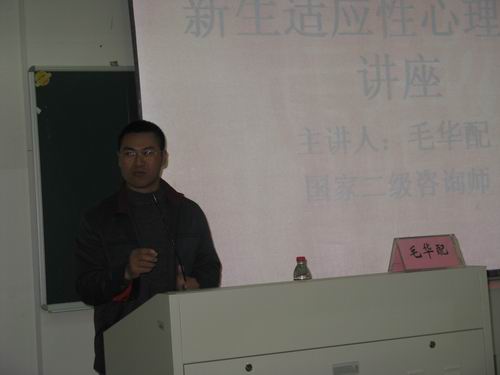 新生适应性心理健康讲座在北校区人文楼203教室举行,担任主讲的是国家二级咨询师毛华配老师。