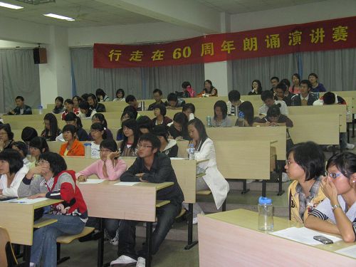 “行走在60周年”朗诵演讲比赛预赛在1-203准时开始,共有14位优秀的选手参加了本次的比赛。每位选手以“我的祖国”为主题,通过诗歌朗诵的方式表达了自己对祖国深深地热爱和敬意。他们深情并茂、激情澎湃的朗诵也感染了在场的所有同学,教室内掌声不断。最终,09中本二班沈琴、沈晓娟、吴莹萍,09中本三班陈媛媛,09广本张恒宇、葛连燕,09历本吴弘泽,08中本一班冯静安突出重围,进入决赛。