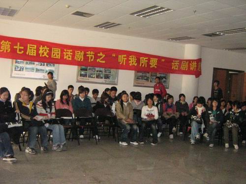 学生以及全校热爱话剧的同学在大学生活动中心素拓培训室听取严路明老师关于话剧表演、导演及剧本创编的指导讲座。