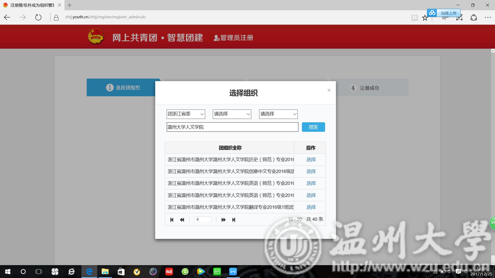 (1) 选择“团浙江省委”,输入“成人网站 ”,点击“搜索”。