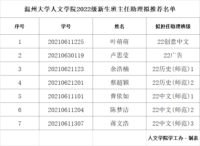 根据学校《关于招募2022级新生班主任助理的通知》要求和相关文件精神,经过学生个人申请、学院初审、公开竞聘等环节,按照专业相近原则,现将成人网站 2022级新生班主任助理拟推荐名单公示如下。