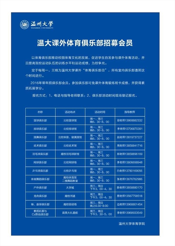 关于2015-2106-2学期温大课外体育俱乐部招募会员的通知